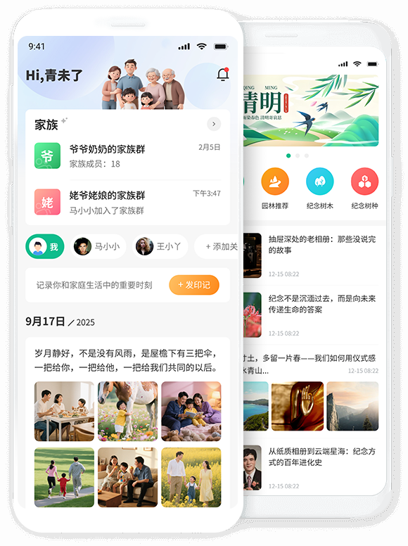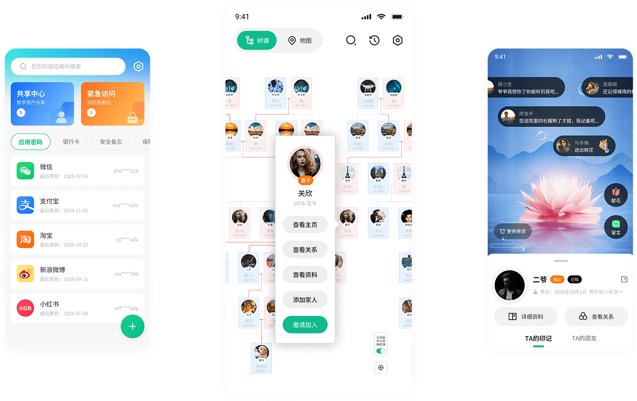 以亲缘关系为纽带,绘制亲情图谱,为亲缘用户提供生活印记分享、数字资产保护、生命树纪念等服务